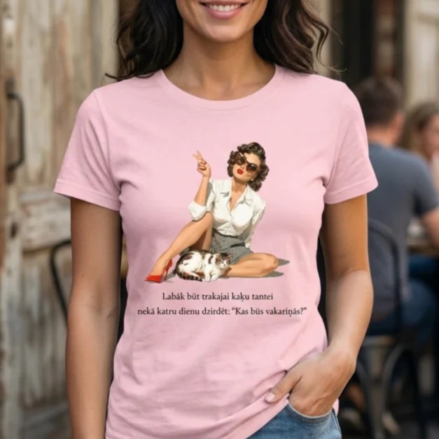 Ja tev patīk kaķi, humors un neliela devu pašironijas, šis T-krekls ir tieši tev. Retro stilā veidots dizains ar elegantas “kaķu tantes” ilustrāciju piešķir T-kreklam īpašu raksturu un padara to par sarunu sākumu jebkurā vietā.