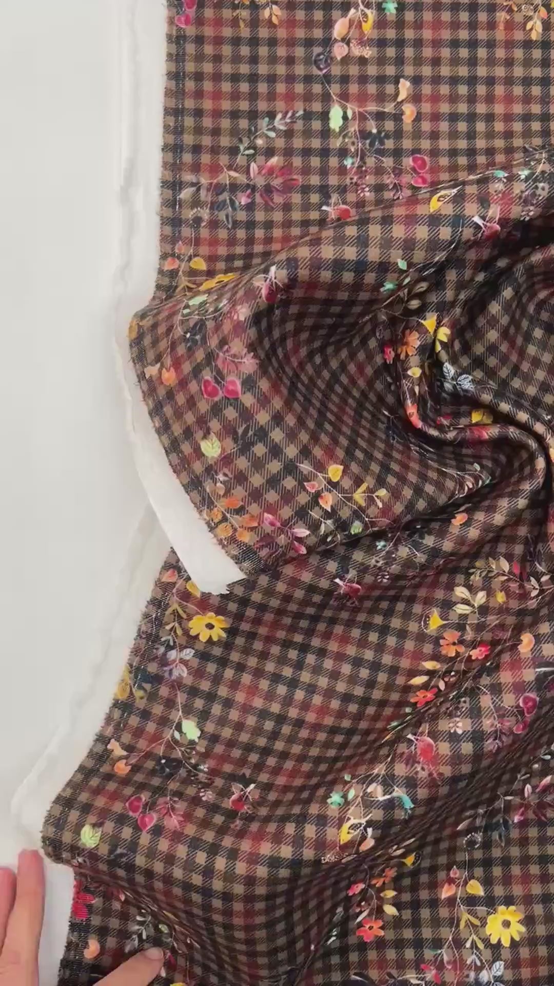 Itaalias valmistatud tihe tweed-kangas ruudulise mustri ja mitmevärvilise lilletrükiga. Kangas on raskepärane, vastupidav ja mitteveniv, sobib vormikatele ülerõivastele. Suurepärane valik mantlitele, jakkidele ja struktureeritud rõivastele.