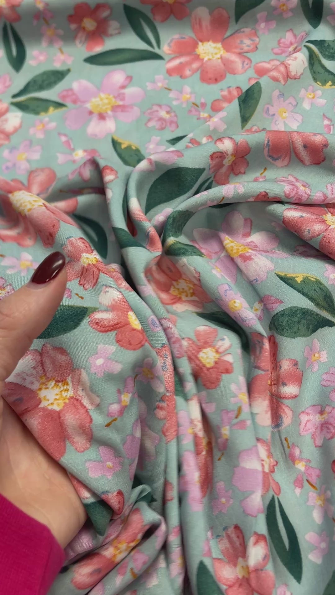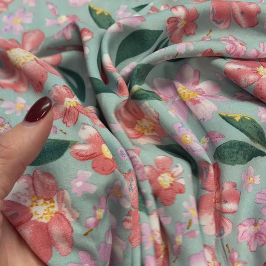 100% Viskozes audums- puķes uz mint fona 135 g/m²