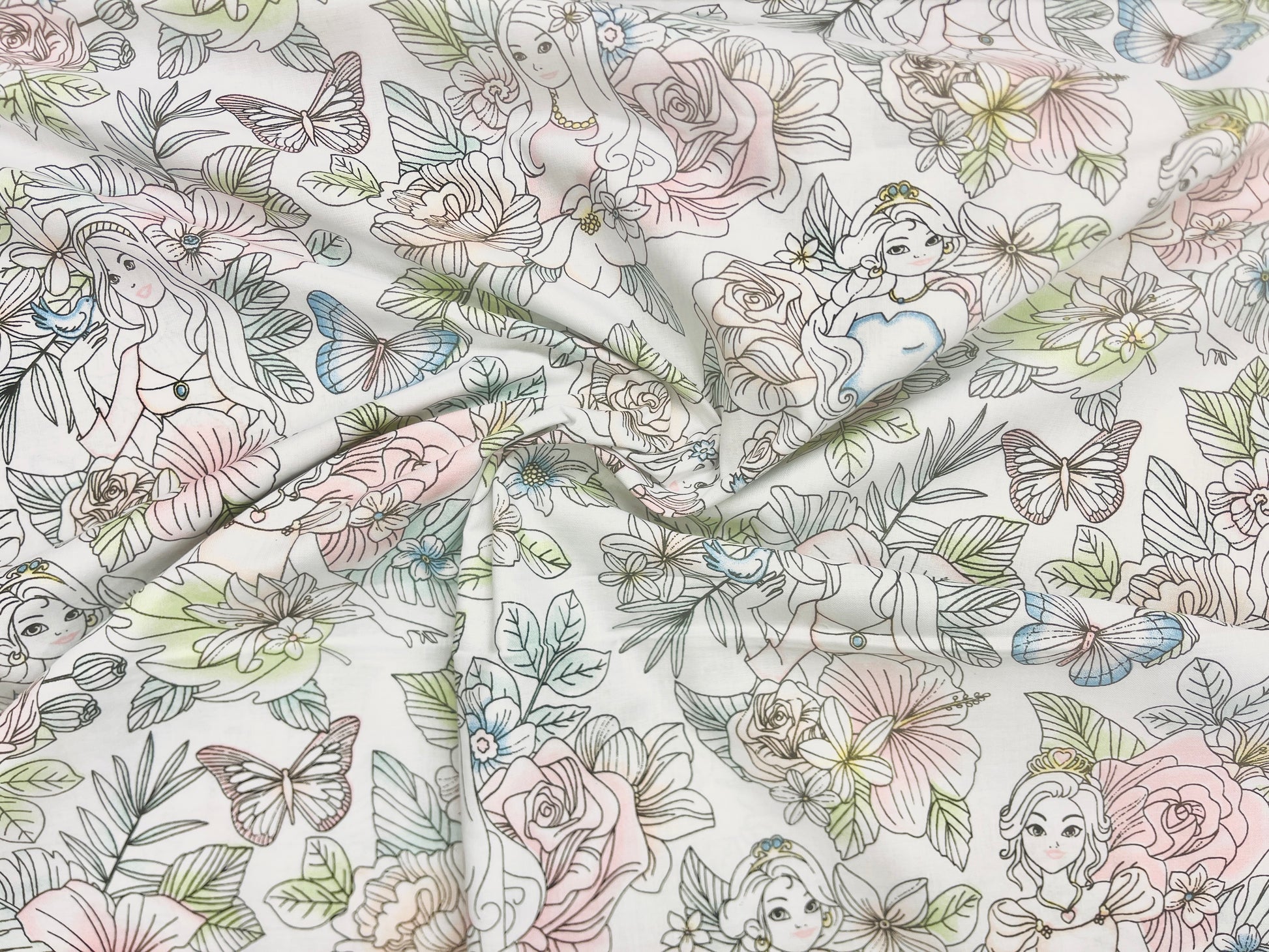 100% Kokvilnas audums- princeses ar sārtiem un ziliem,zaļiem akcentiem 125 g/m