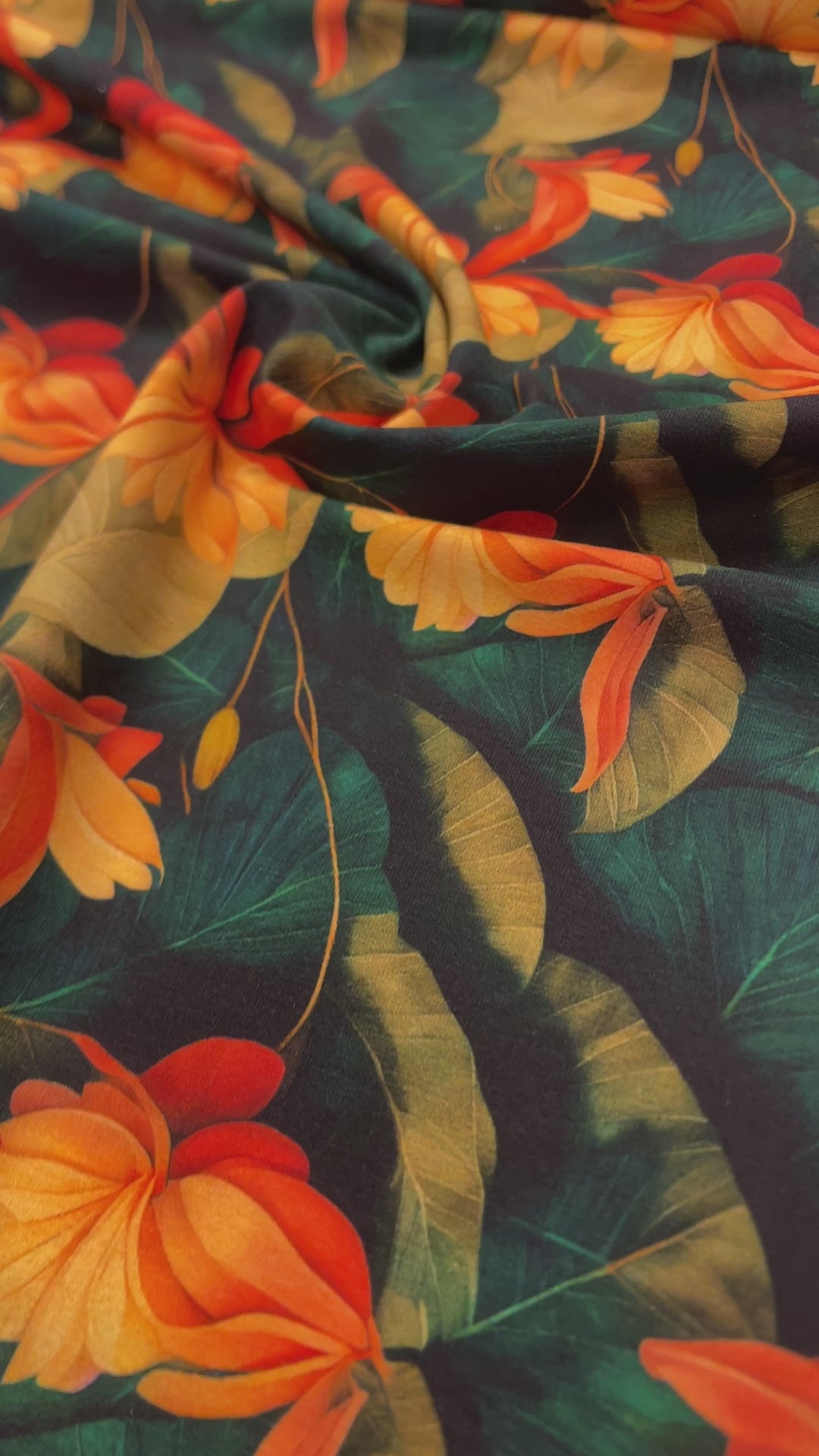 Kokvilnas trikotāža-oranži tropiski ziedi 250 g/m²