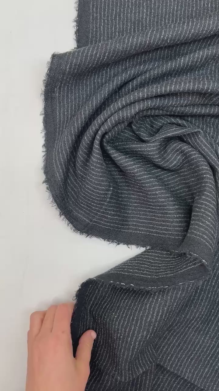 Augstas kvalitātes krēpa audums ar viegli reljefu virsmu un smalkām svītrām pelēkos un melnos toņos. Pateicoties lielajam vilnas saturam, tas ir silts, mīksts un labi tur formu – perfekts kostīmiem, žaketēm un klasiskiem bikšu piegriezumiem.