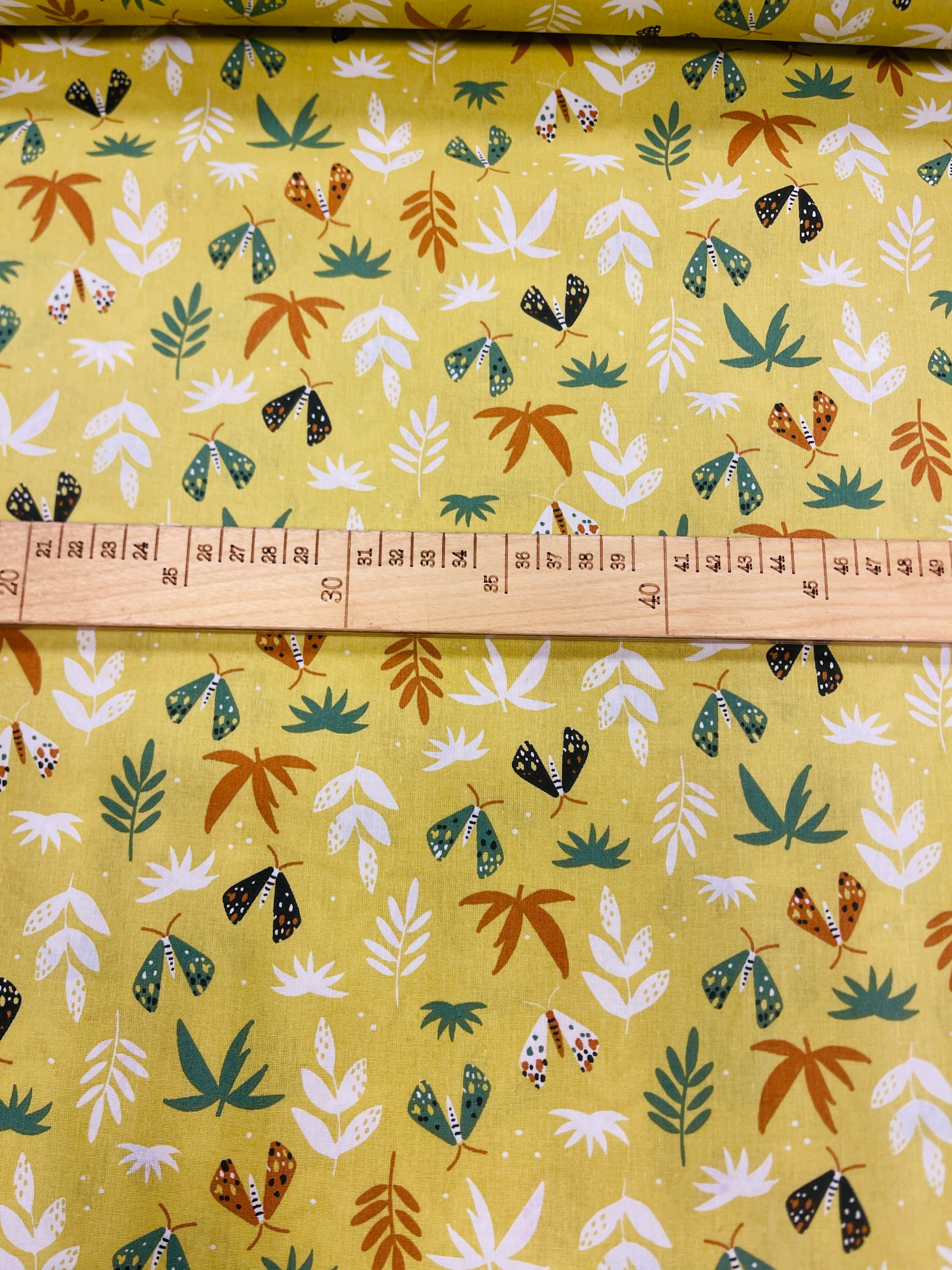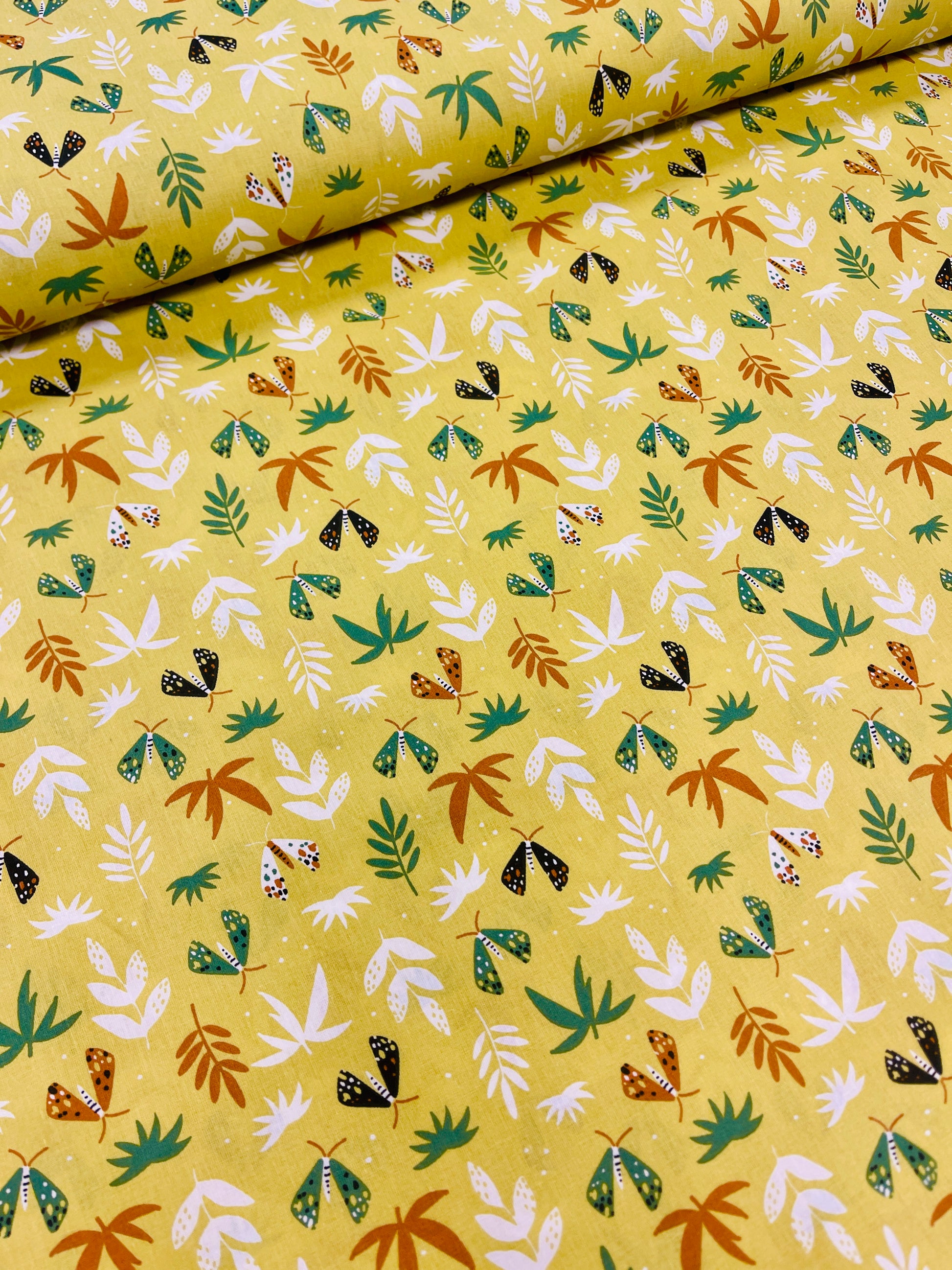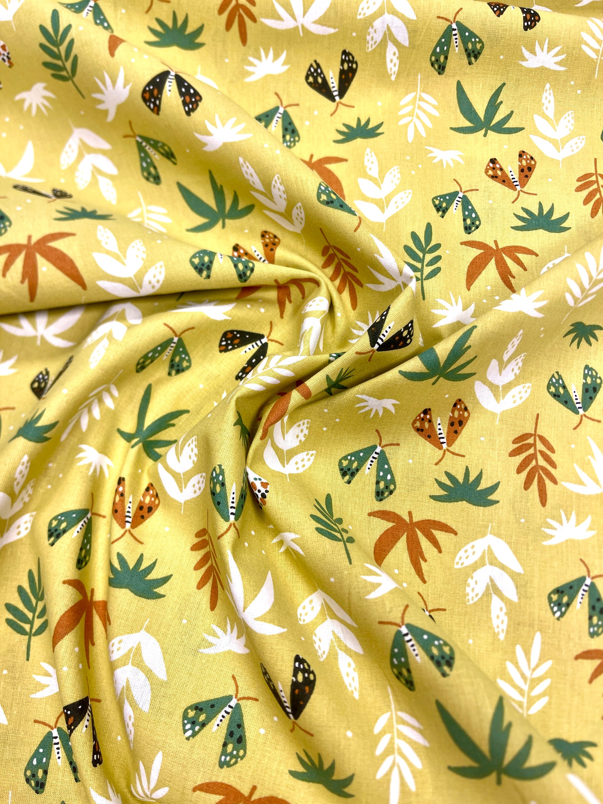 100% Kokvilnas audums-lapiņas uz dzeltenzaļa fona 125 g/m²