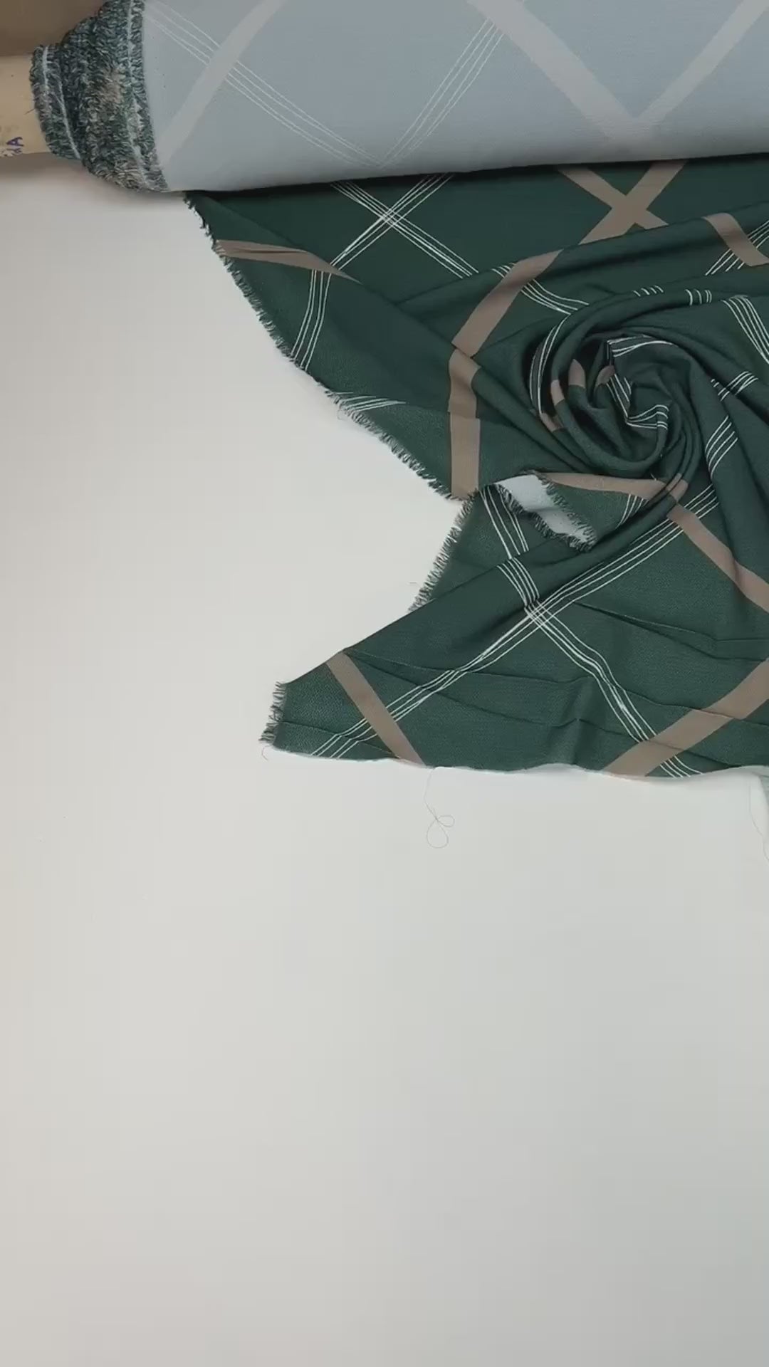 Elegants Itālijā ražots krepa audums ar ģeometrisku rakstu zaļos toņos — viegls, elpojošs un piemērots kleitām, blūzēm, svārkiem un citiem sieviešu apģērbiem.