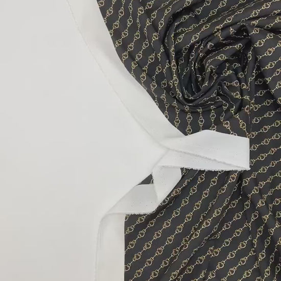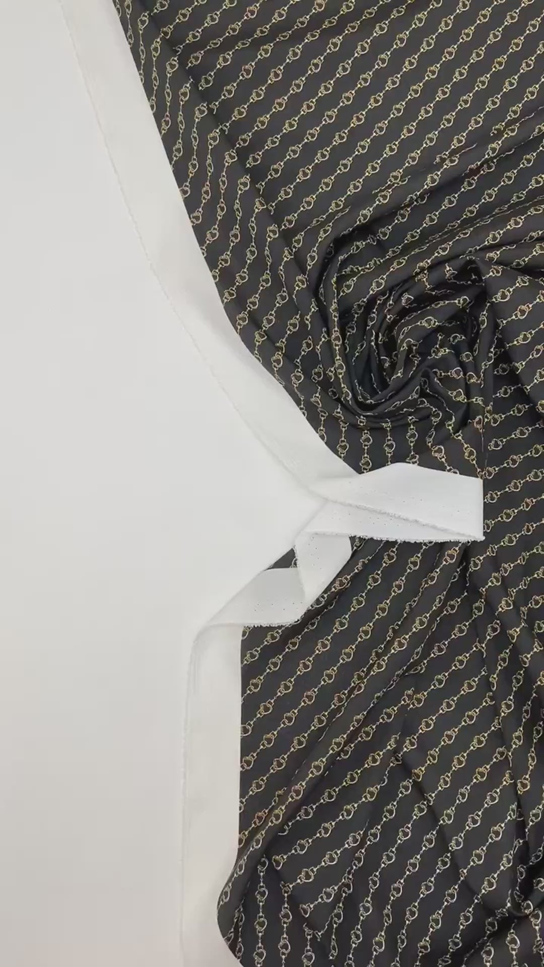 Itālijā ražots krepa audums ar elegantu ķēdīšu rakstu bēšos un melnos toņos — ideāls kleitām, blūzēm un viegliem apģērbiem. Materiāls ir 100 % poliesters, neelastīgs, ar maigu faktūru un raksturīgu krepa kritumu. Audums ir viegls un elpojošs, lieliski piemērots gan ikdienas, gan svinīgiem šūšanas projektiem.