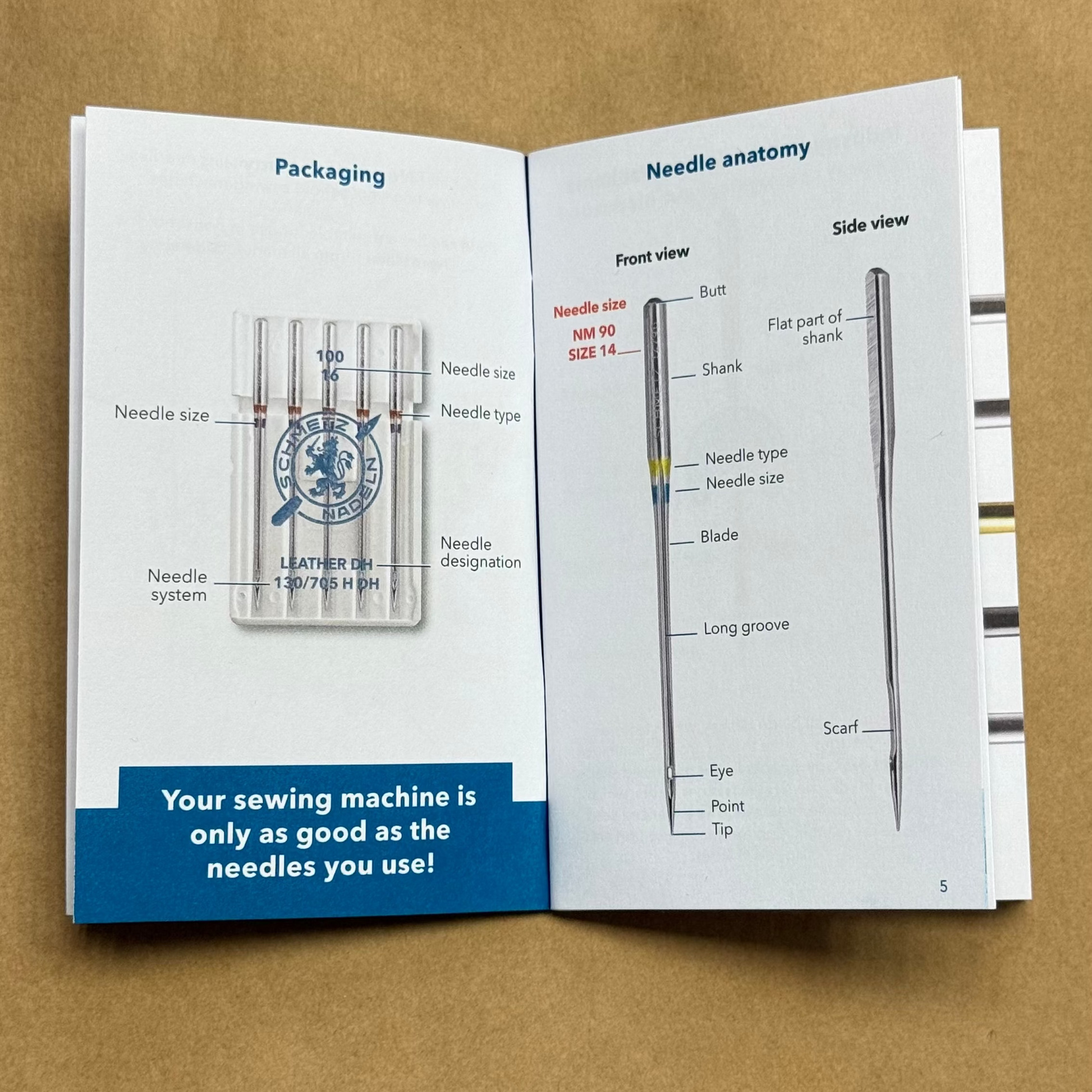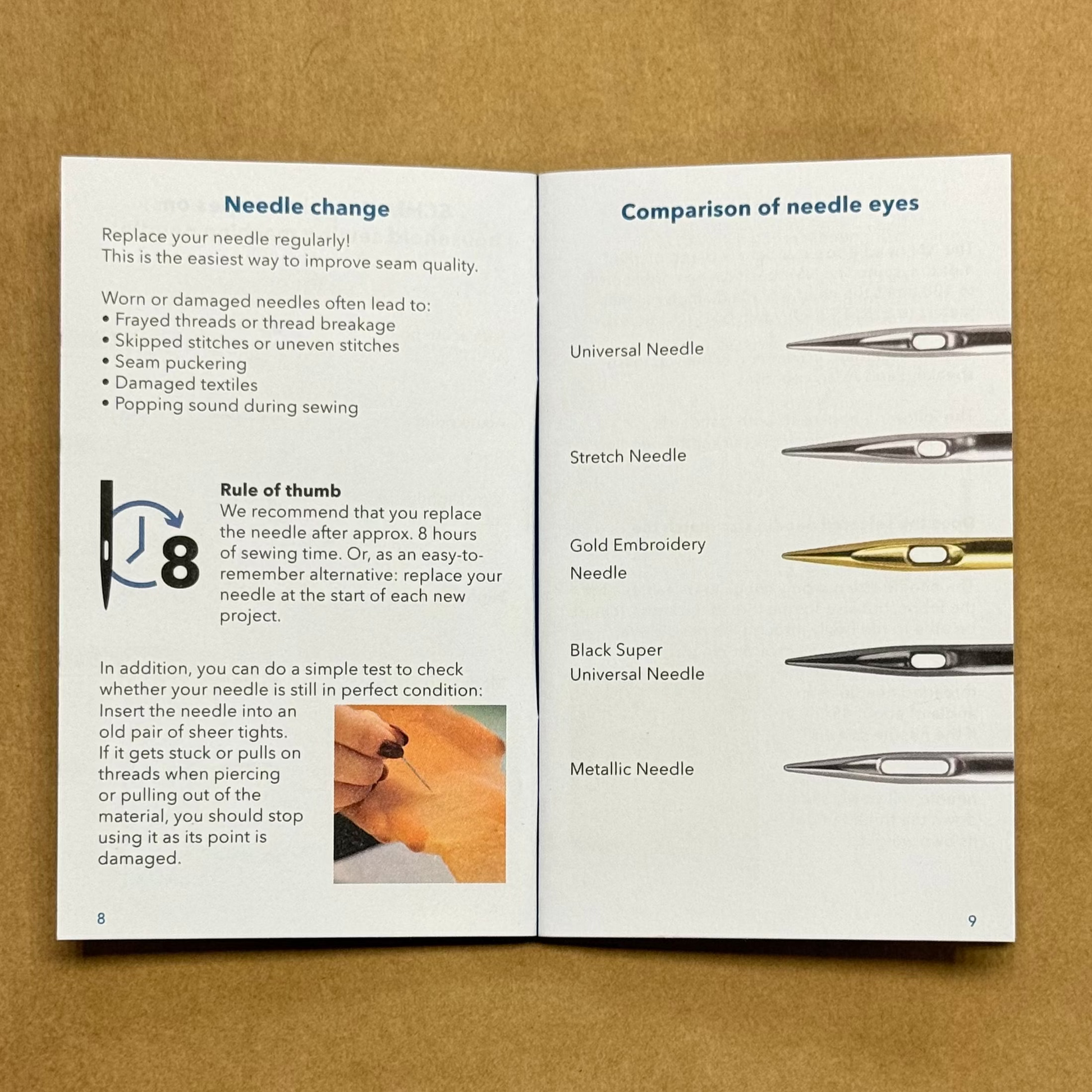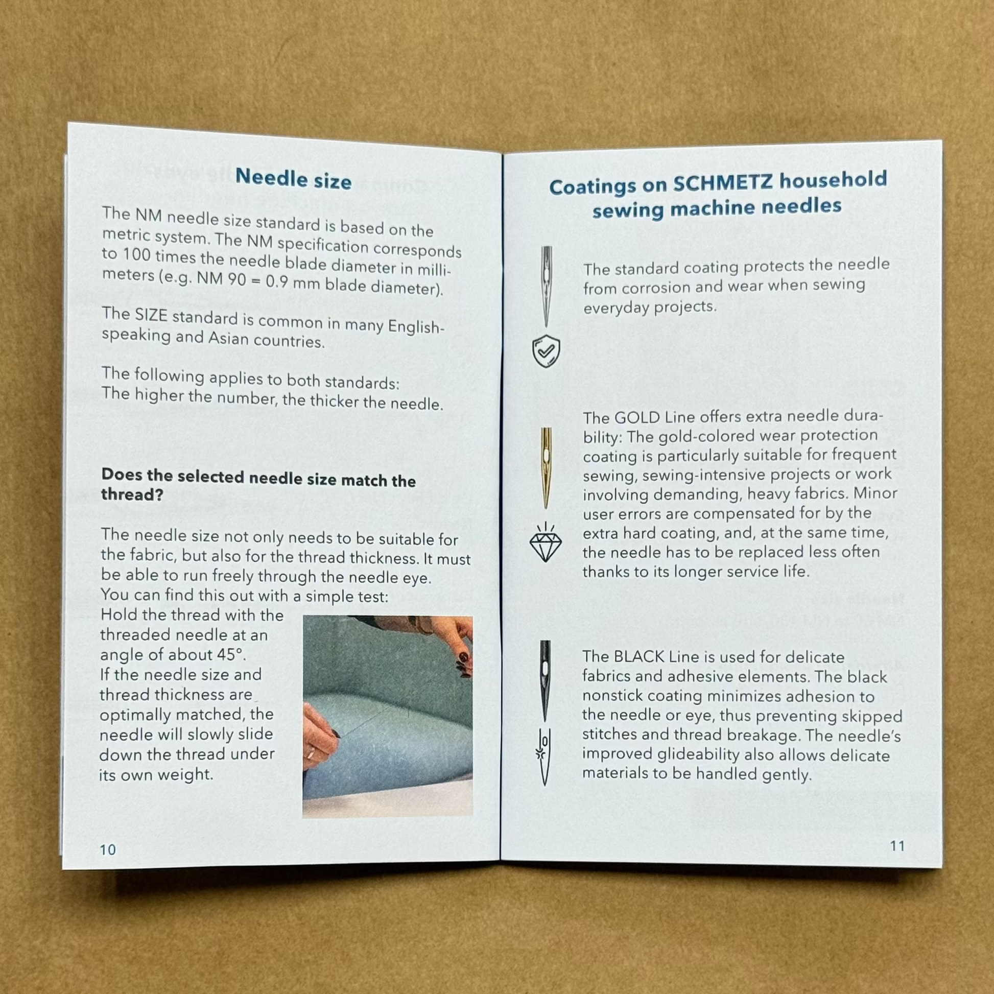 Uzticams, ātri pārskatāms SCHMETZ adatu ABC ceļvedis PDF formātā. Ideāli, lai ātri izvēlētos pareizo adatu katram audumam un projektam — no trikotāžas līdz džinsam un smalkiem audumiem.