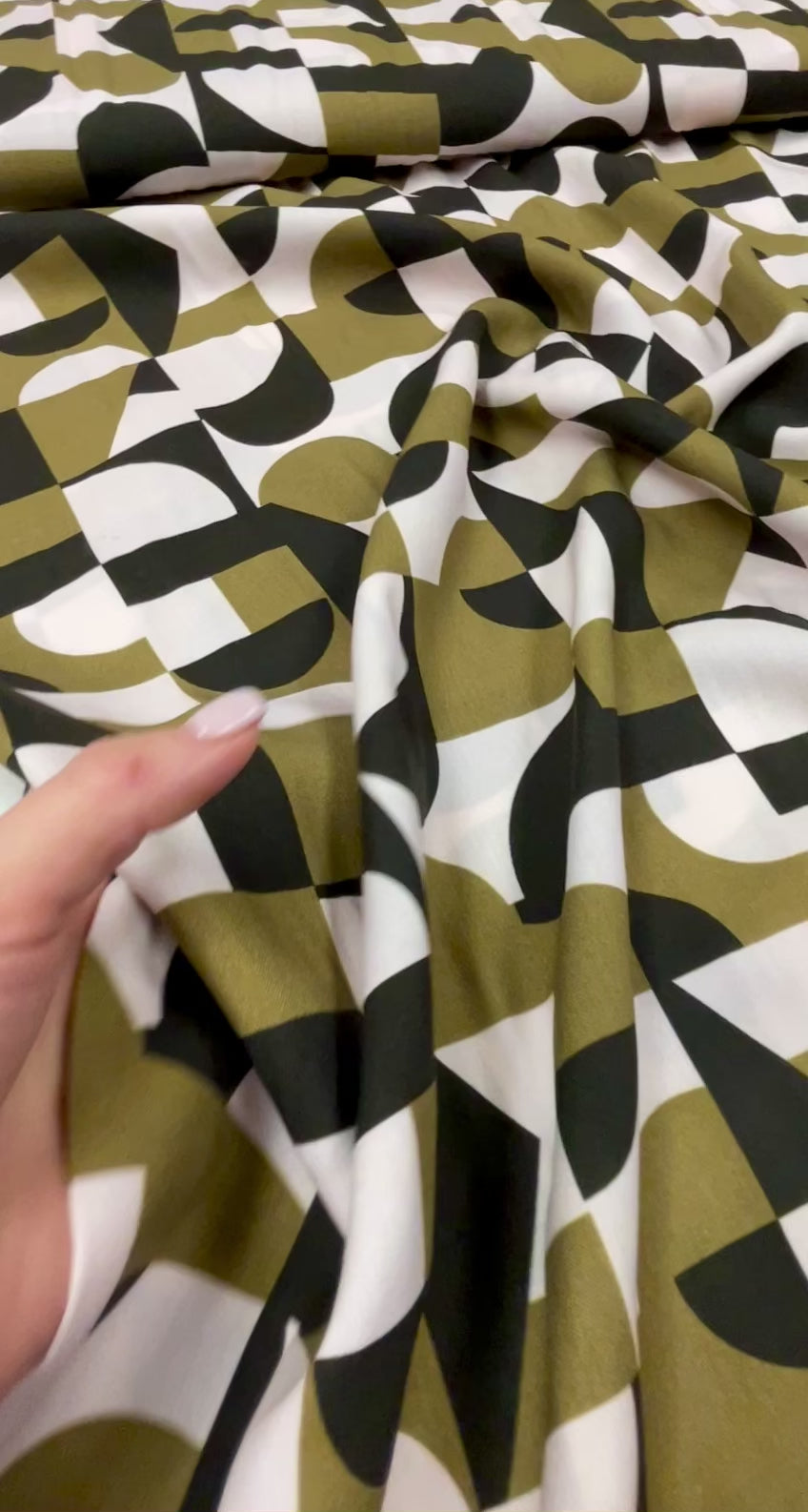 100 % viskozės audinys – chaki, juodai baltas raštas, 125 g/m²